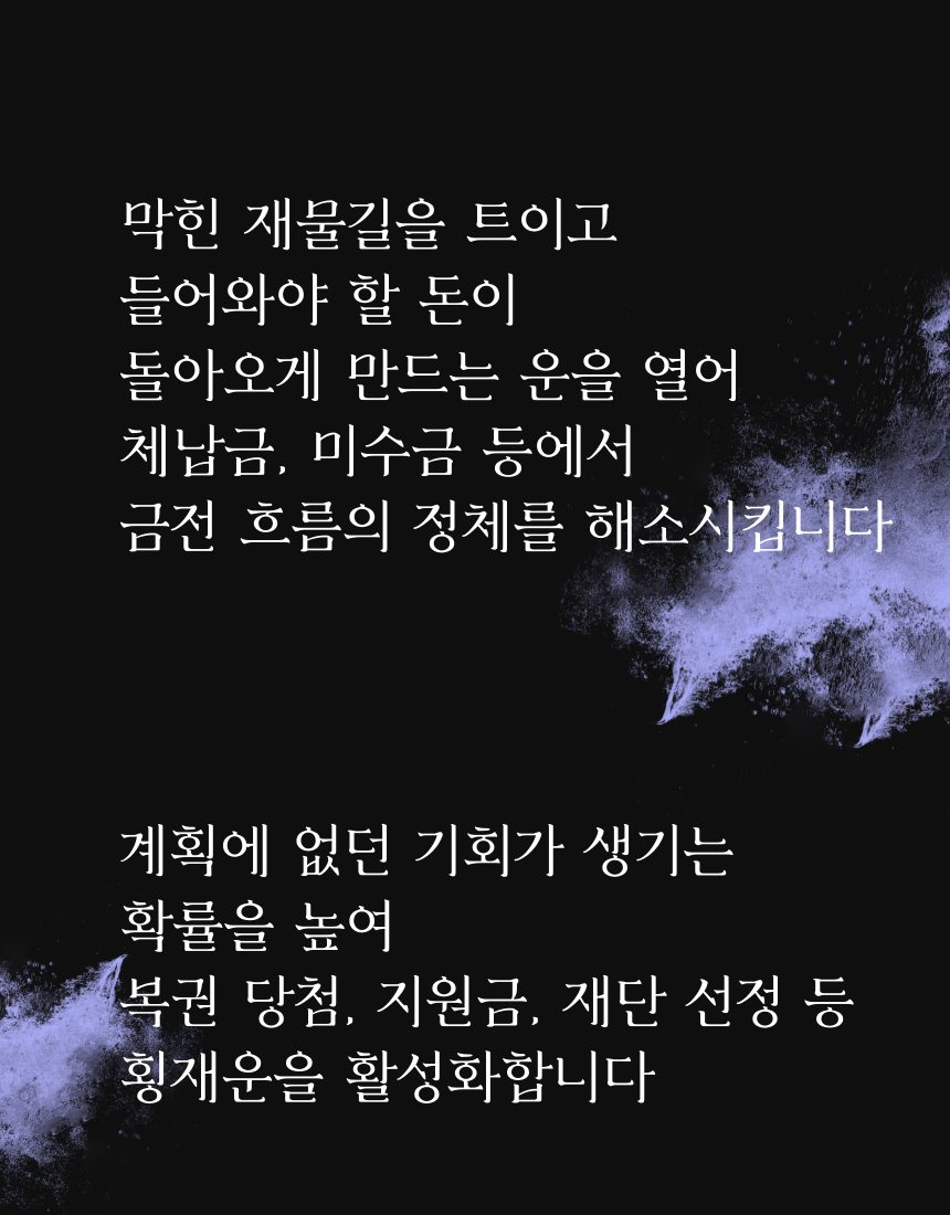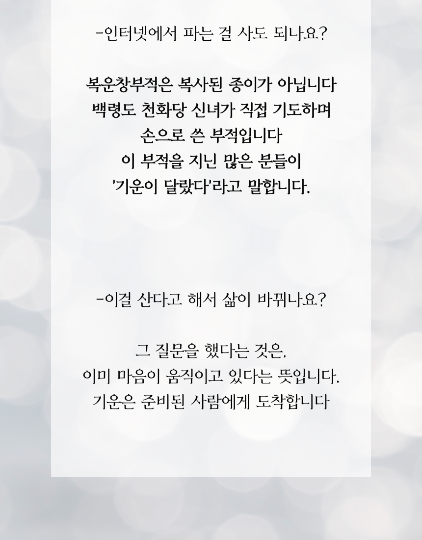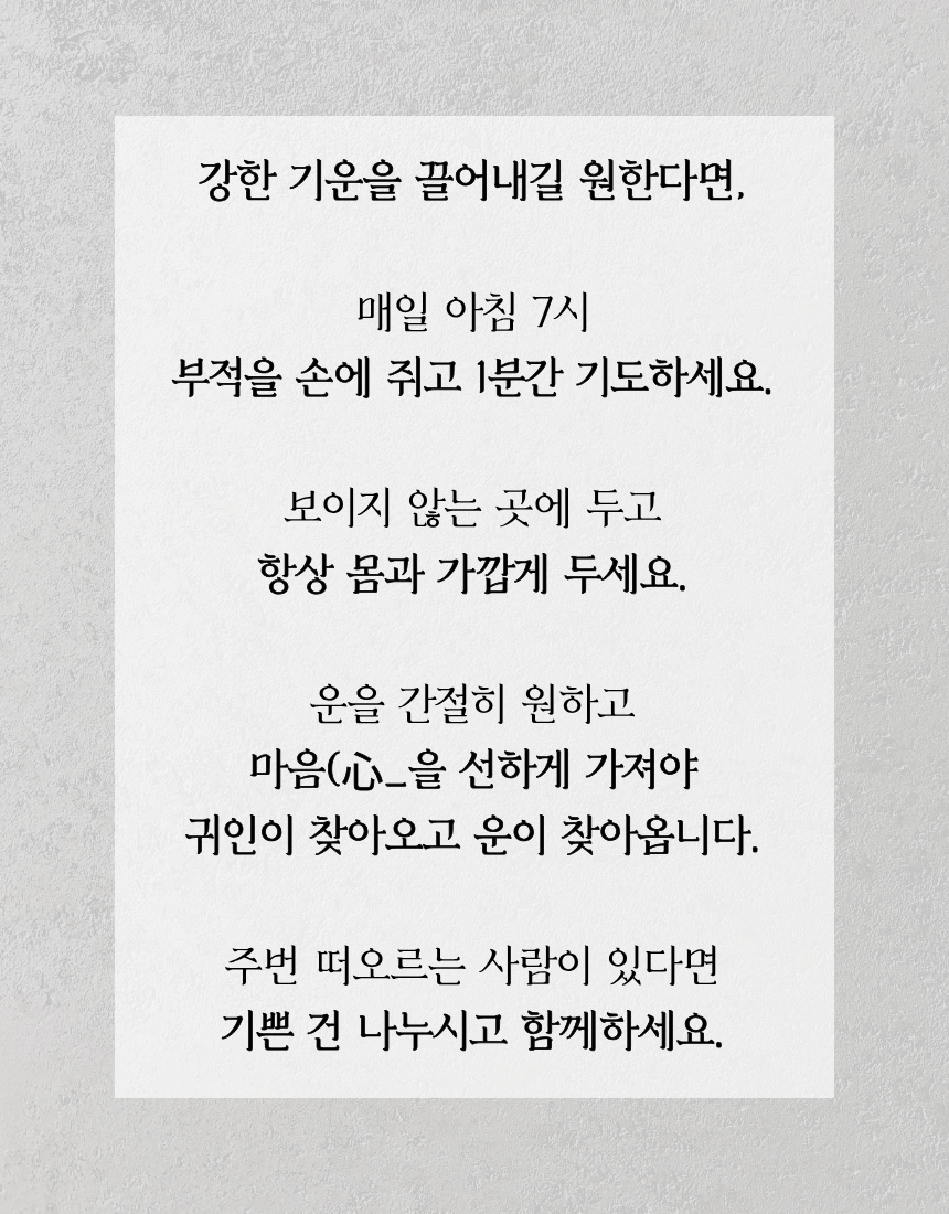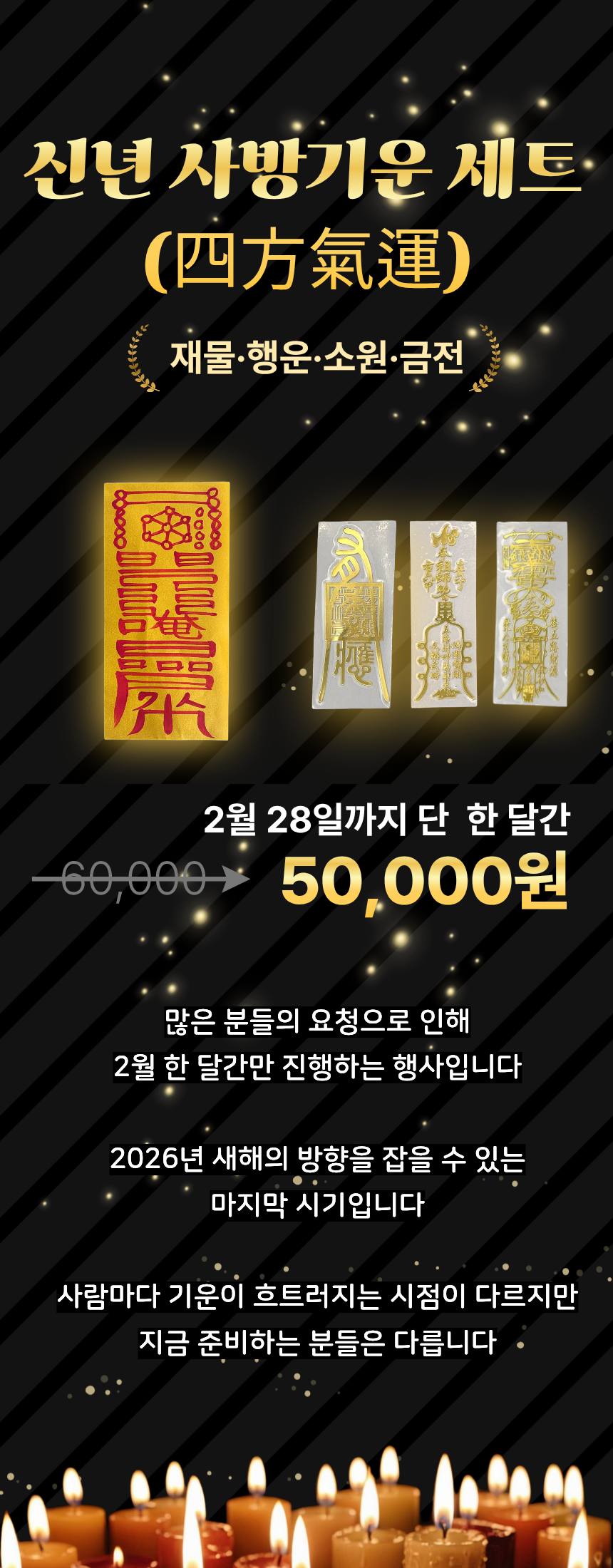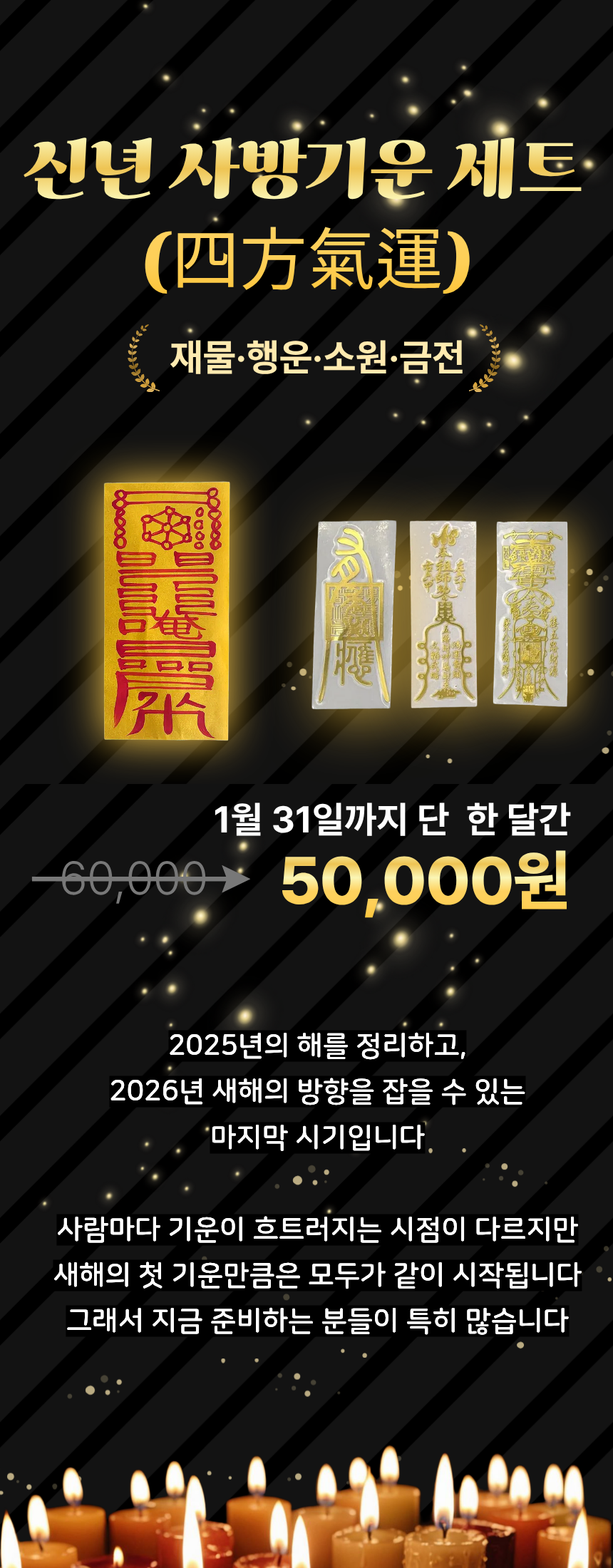 구매하기 장바구니 ♥ 성함 생년월일 + 추가 옵션 선택 [증폭기운] 금전 재물의 기운을 증폭시키는 복인장 복인장 [재물부] 추가(+10,000) 복인장 [소원성취부] 추가(+10,000) 복인장 [행운부] 추가(+10,000) 행운의 빛누리 신년사방기운(四方氣運)세트 옵션 선택 신년사방기운(四方氣運)세트(+20,000) TOTAL 0 구매하기 장바구니 ♥