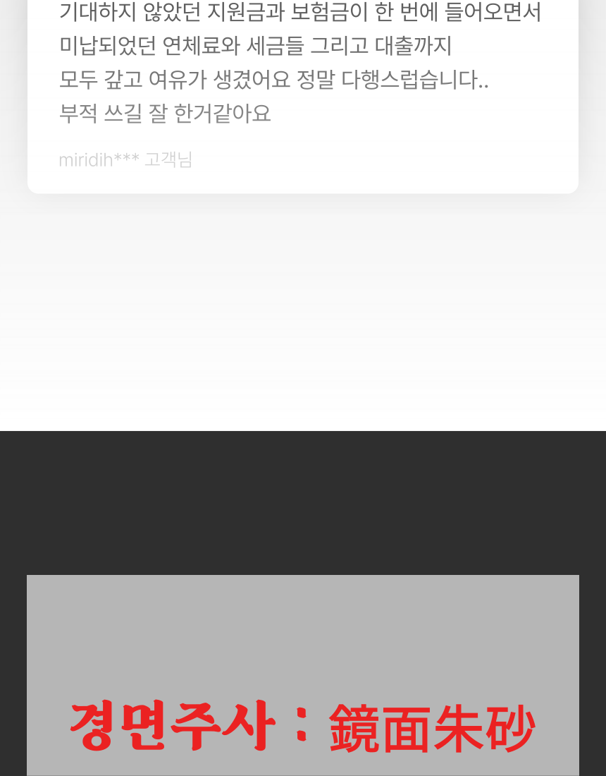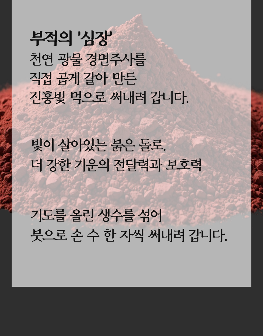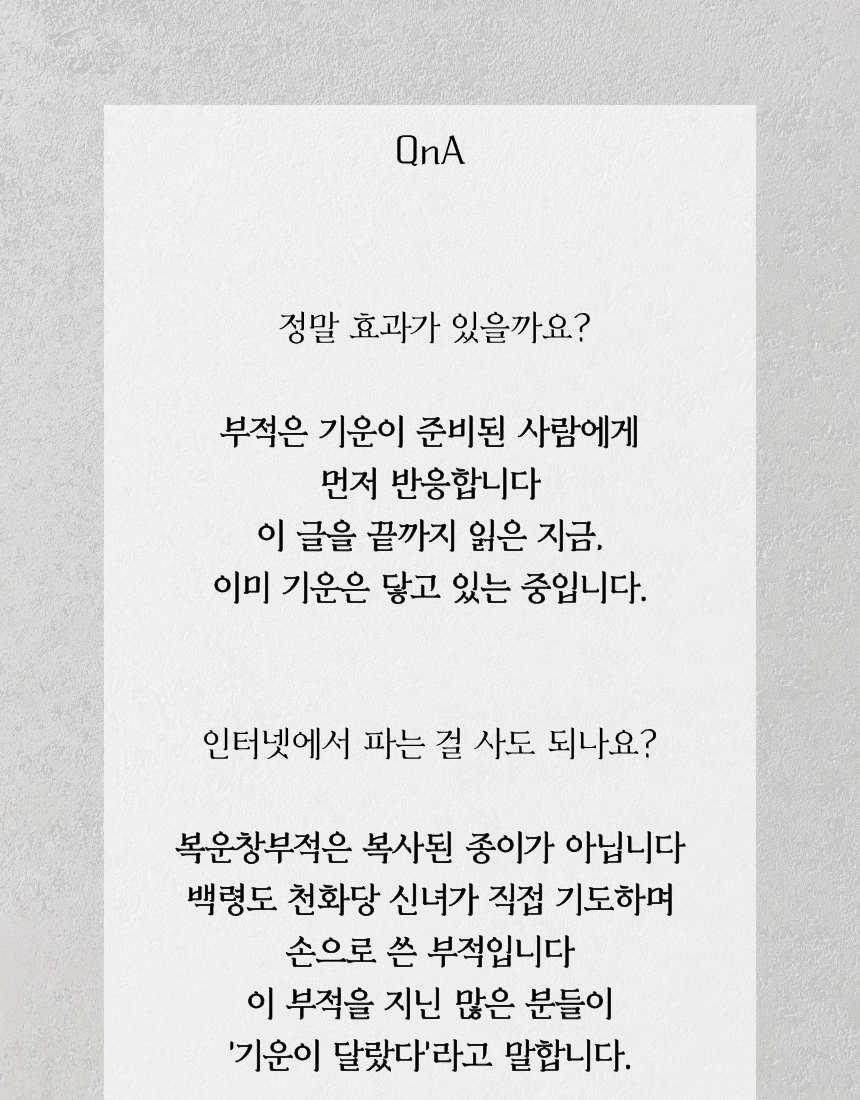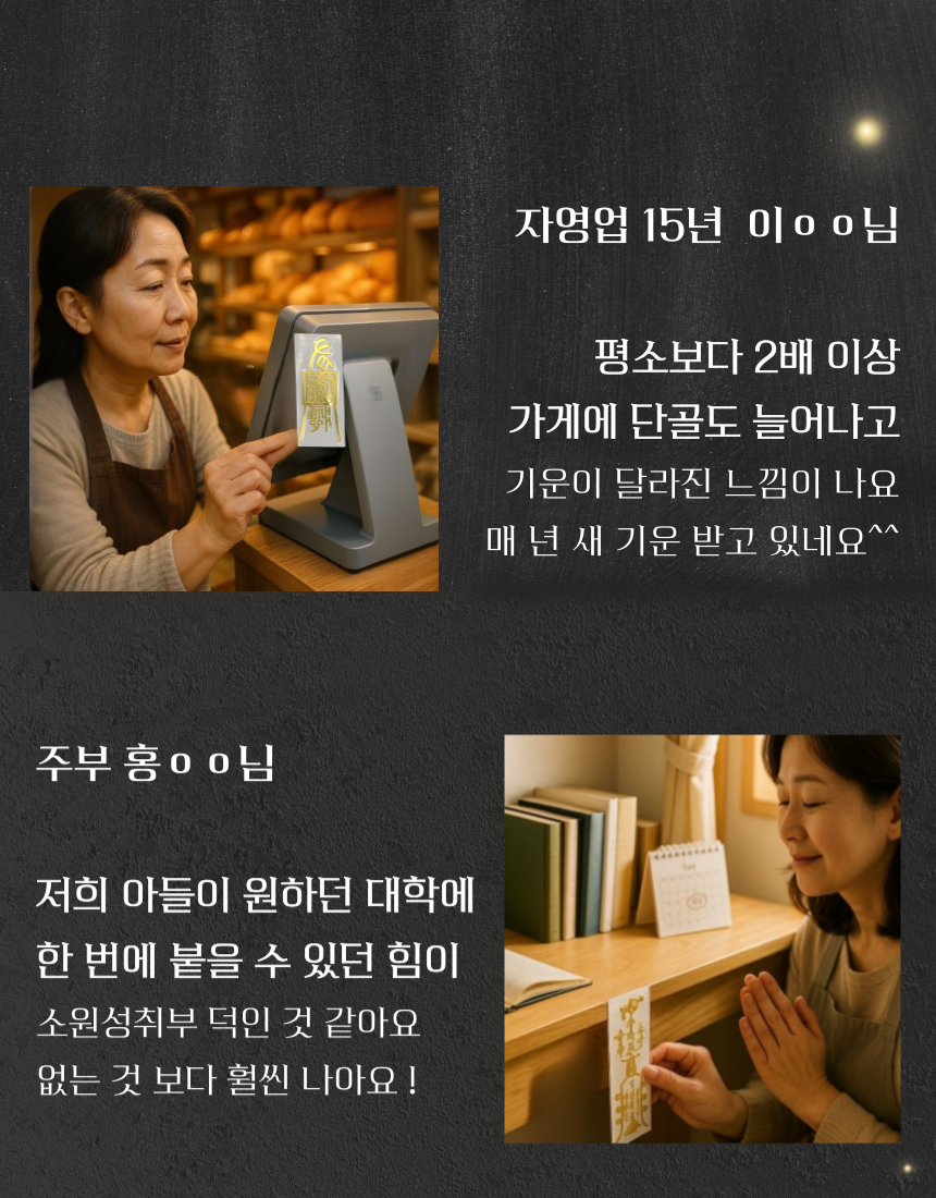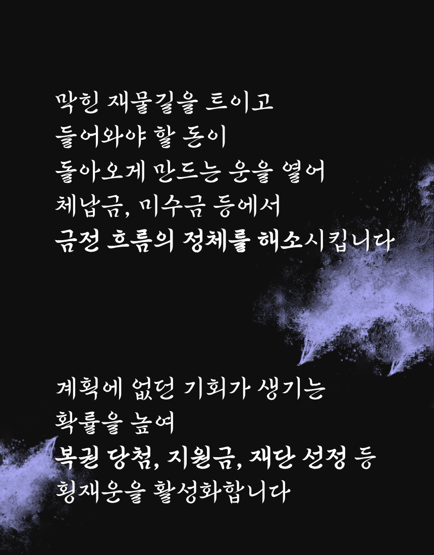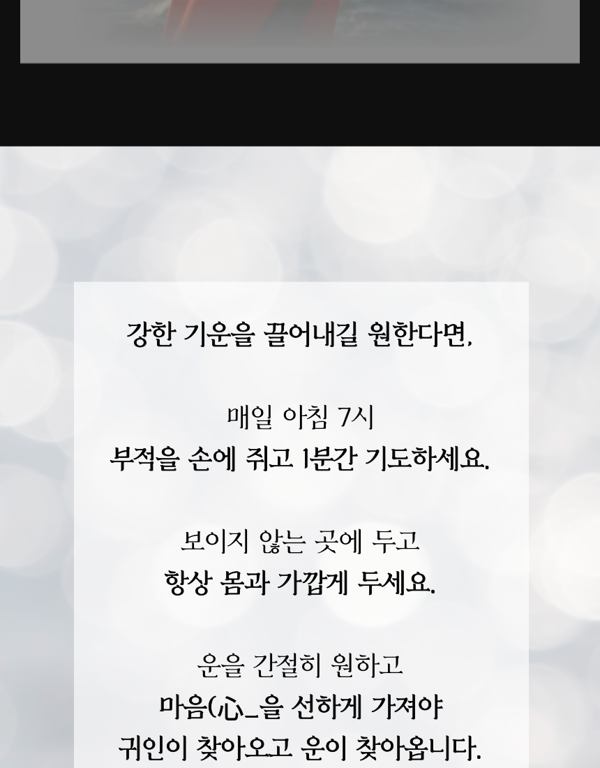 구매하기 장바구니 ♥ 성함 생년월일 + 추가 옵션 선택 [증폭기운] 금전 재물의 기운을 증폭시키는 복인장 복인장 [재물부] 추가(+10,000) 복인장 [소원성취부] 추가(+10,000) 복인장 [행운부] 추가(+10,000) 행운의 빛누리 신년사방기운(四方氣運)세트 옵션 선택 신년사방기운(四方氣運)세트(+20,000) TOTAL 0 구매하기 장바구니 ♥