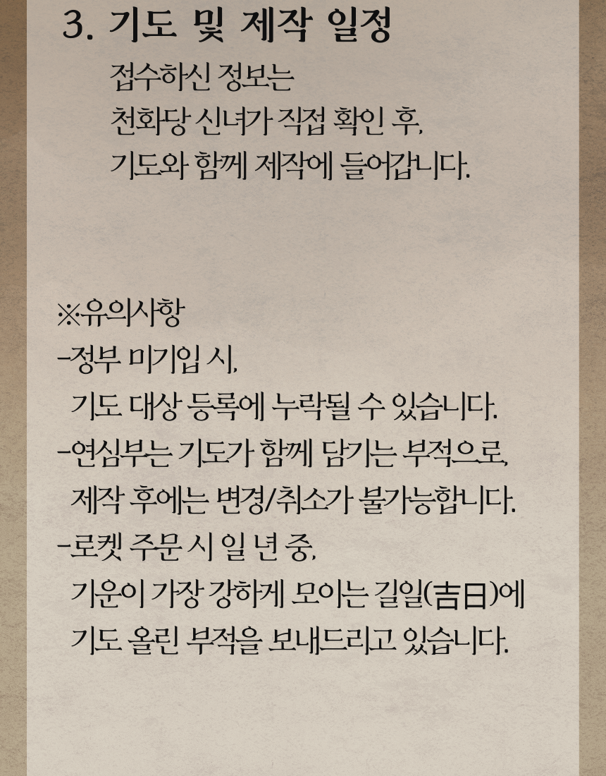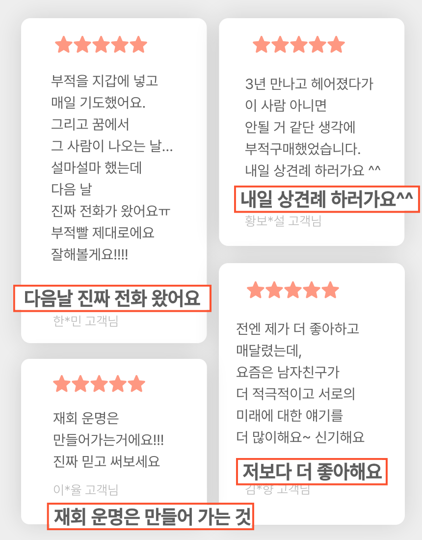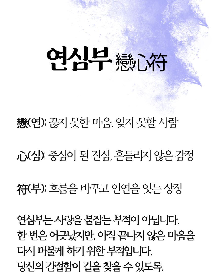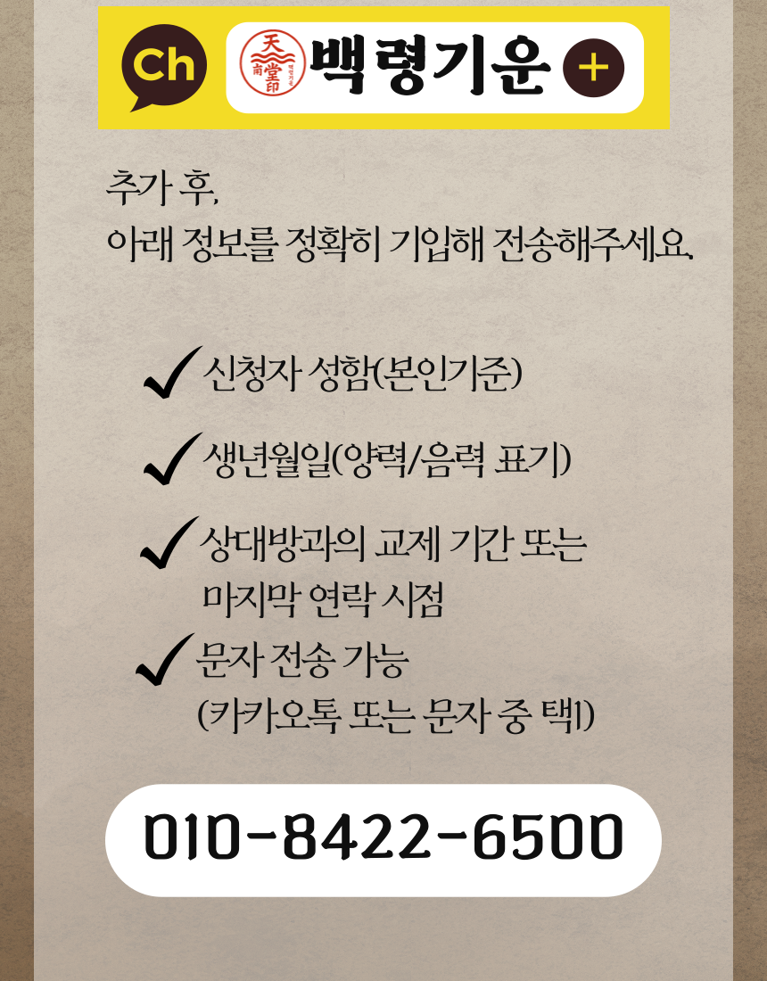 구매하기 장바구니 ♥ 재회할 분 성함 만난 기간 또는 알게 된 기간 추가 구성 상품 재물부,행운부,소원성취부 복인장 (택1) 10,000 복인장 분류 선택하세요 옵션 선택 재물부 행운부 소원성취부 TOTAL 0 구매하기 장바구니 ♥