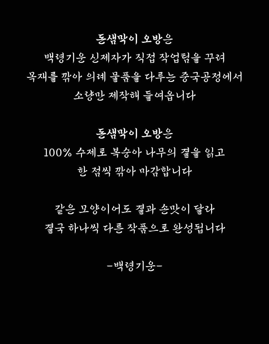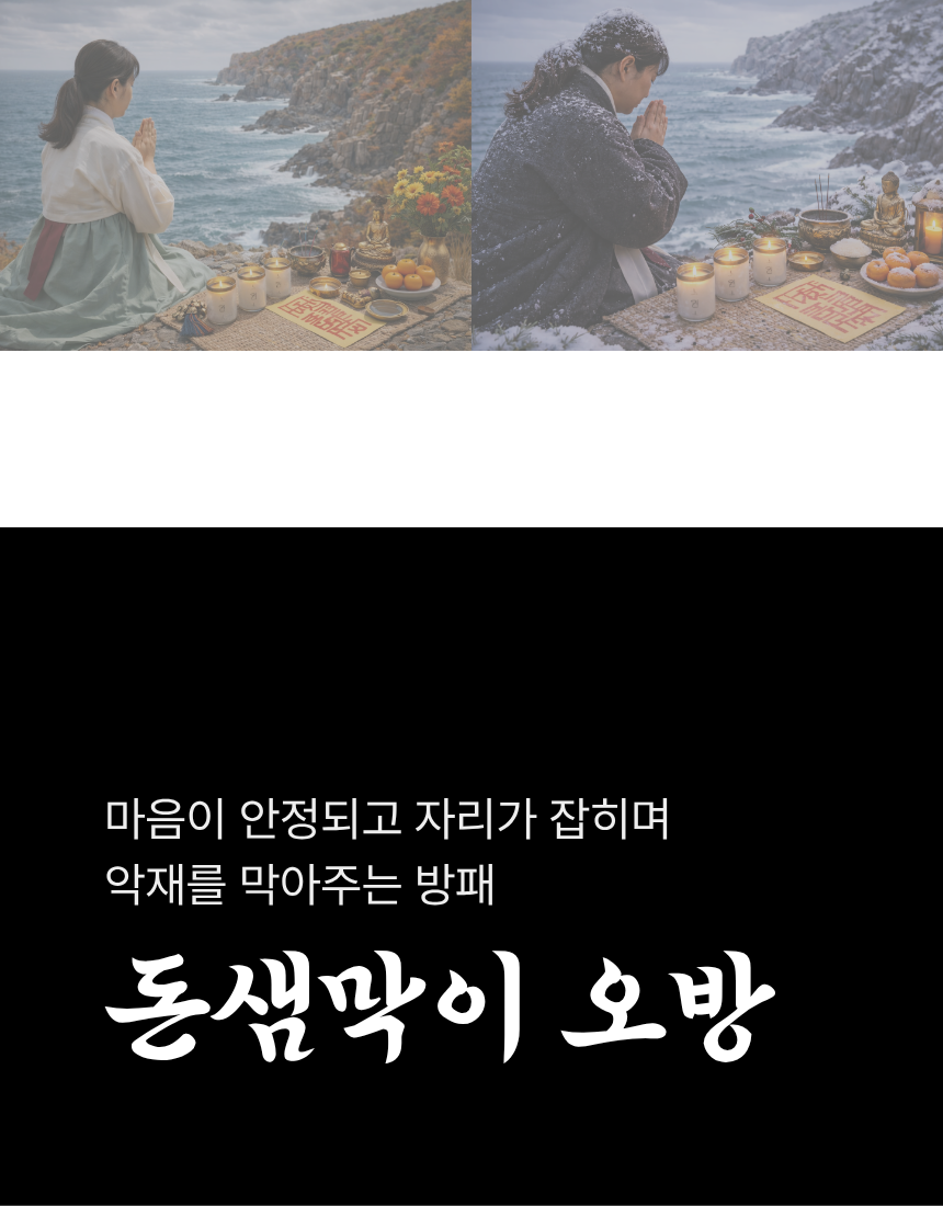 구매하기 장바구니 ♥ 돈샘막이 낱개 구매 옵션 선택 붓 칼 도끼 도깨비방망이 단검 재물운 일으키는 돈샘막이 오방 옵션 선택 선택안함 오방 세트로 구매(+49,000) TOTAL 0 구매하기 장바구니 ♥